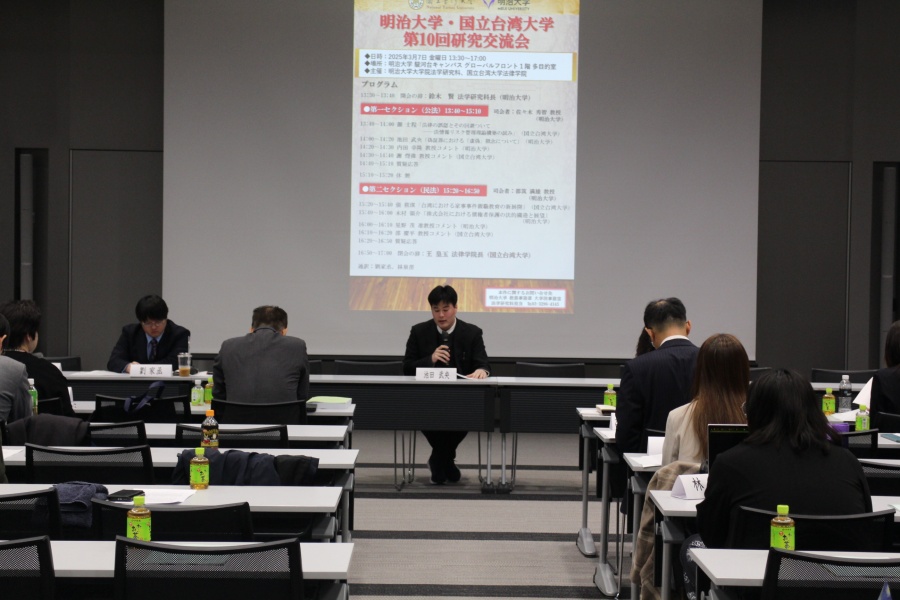 本研究交流会は、本学と国立台湾大学で開催地を交互に毎年開催されています。研究交流会では、公法、民法分野を中心に、本学及び国立台湾大学の院生がそれぞれ発表を行い、各セクションでは,質問が飛び交い、活発な議論が行われました。