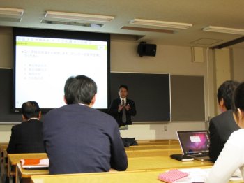 阪井教授は「ケータイツールを活用した面接授業の改善:法学部初年時における論理思考力の向上に向けて~補助教材の改善と学習者の行動変化を確認するアンケートの作成~」として,冒頭に本学で2004年7月に行われた川島高峰情報コミュニケーション学部准教授による携帯電話を活用した授業について映像を交えて紹介し,自身の取り組みについても紹介。ケータイツールを活用した授業運営として,学生の特性と効果的な対応方法について説明し,具体例として「日本語論理トレーニング」の授業改善について報告を行いました。