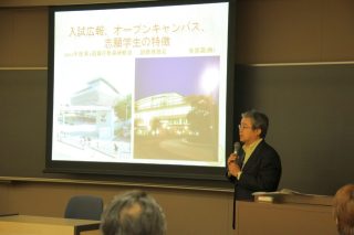 続いて竹本センター長が学生の入口と出口にあたる「入試」と「卒業生の進路」について本学の概要を話しました。山田朗副教務部長(文学部教授)および鳥居高副教務部長(商学部教授)から、入試制度や入試広報、オープンキャンパス等の取り組みについて、矢ケ崎淳子副教務部長(法学部教授)からは本学の就職・キャリア教育に関する具体的な説明がありました。