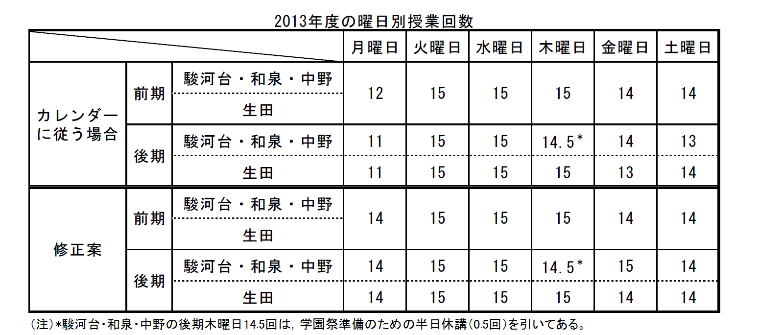 一方,教務部前執行部から引き継いだ事項のうち,授業回数の確保について教務部委員会にWGをつくって検討を行っています。本学学則第19条2では「各授業科目の授業は,15週にわたる期間を単位として行うものとする」と定め,中央教育審議会答申「学士課程教育の構築に向けて」(2008年12月)は「講義であれば1単位当たり最低でも15時間の確保が必要とされる。これには定期試験の期間を含めてはならない。」としています。しかしながら,これまでの考え方や前提のままで15回の授業回数を確保することは困難です。ハッピーマンデーにより月曜日の授業回数は少なくならざるを得ず,本学の創立記念祝日(11月1日)と創立記念日(1月17日)は同じ曜日なので当該曜日の回数も少なくなります。そのため,2013年度はカレンダー通りなら表(上段)のような回数になります。回数の算定では考慮していませんが,特に後期は入試業務や特別入試等で休講にせざるを得ない日もあります。