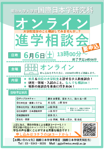 国際日本学研究科では、2027年4月の博士前期課程・博士後期課程入学希望者向けに研究科の概要や入試制度等を紹介すべく、以下のように進学相談会を開催します。当日は、本研究科の各領域担当の教員によるオンライン相談会も実施しますので、進学をお考えの方をはじめ、本研究科に興味をお持ちの方はお気軽にご参加ください!