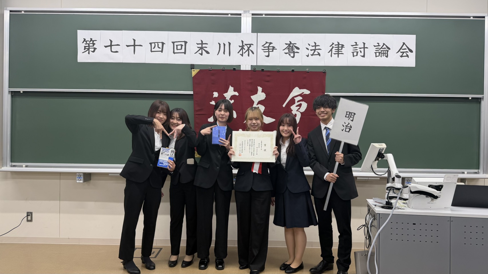 明治大学からは、立論者の南はるかさん、質問者の大竹メイさん、小松麻央さん、坂井りらさん、久光佳怜さん、菊地暖さんの法学部生6名が出場し、全国の舞台で立論の部2位という輝かしい成績を収めました。