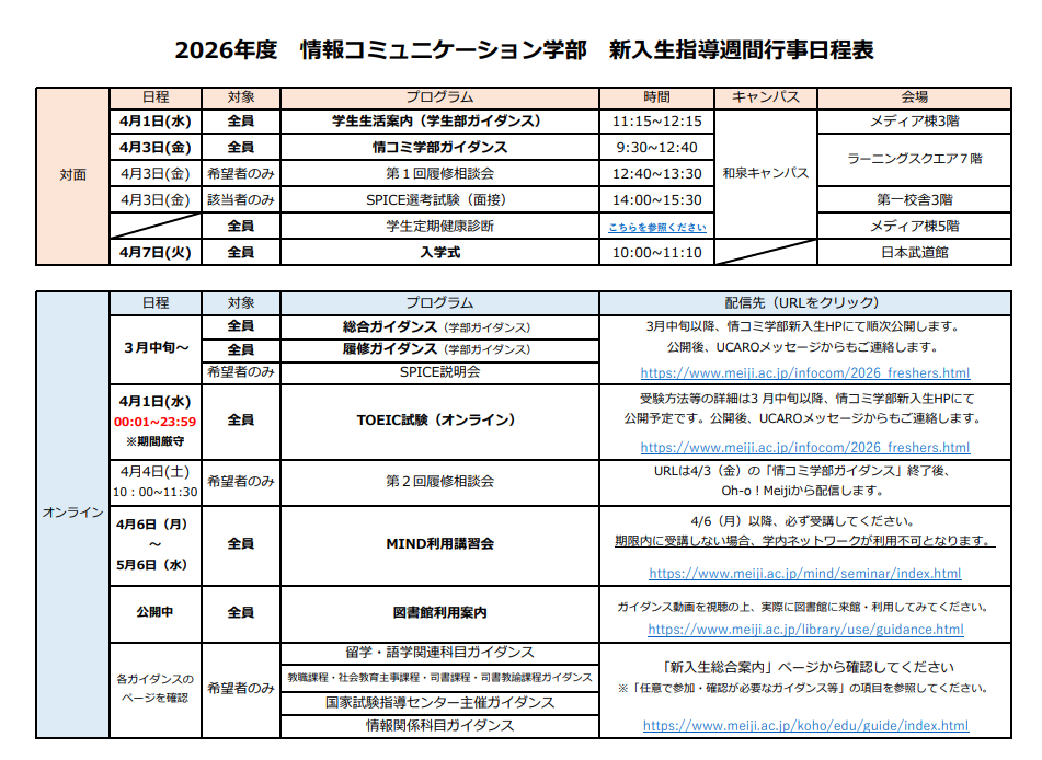情コミ学部新入生へ向けたガイダンス等行事日程一覧です。画像をクリックし、確認してください。