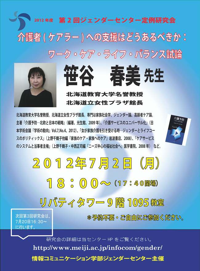 情報コミュニケーション学部ジェンダーセンターは,2012年度第2回定例研究会を以下のとおり開催いたします。ご興味ございましたらぜひご参加ください。