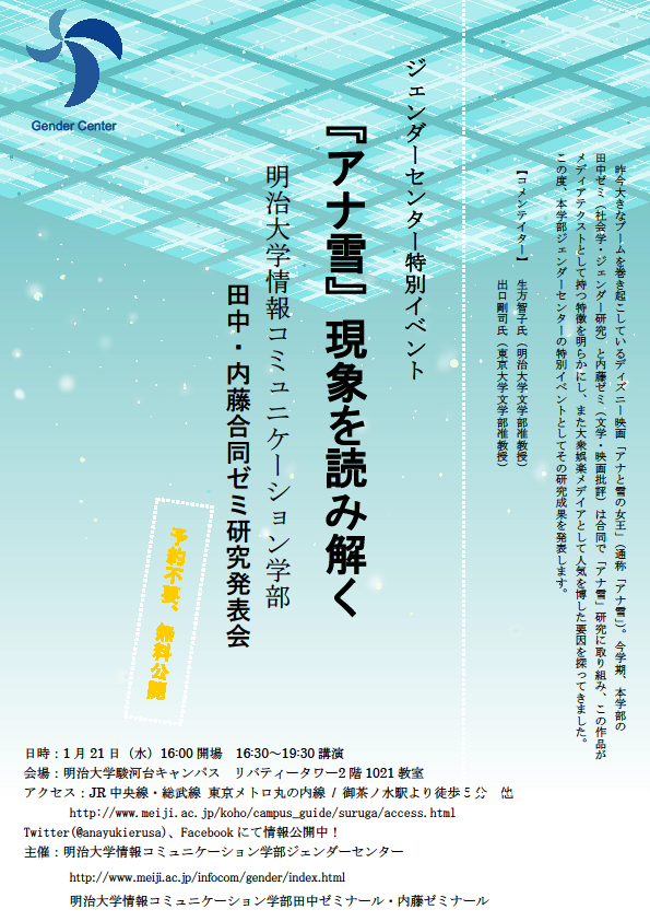昨今大きなブームを巻き起こしているディズニー映画「アナと雪の女王」(通称「アナ雪」)。今学期、本学部の田中ゼミ(社会学・ジェンダー研究)と内藤ゼミ(文学・映画批評)は合同で「アナ雪」研究に取り組み、この作品がメディアテクストとして持つ特徴を明らかにし、また大衆娯楽メデイアとして人気を博した要因を探るべく、活動してきました。この度、その研究成果を発表します。ご関心のある方、奮ってご参加ください。