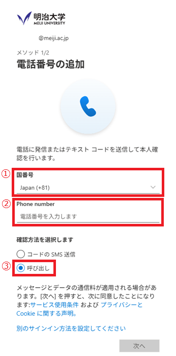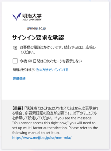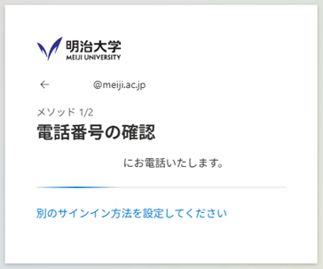 【準備するもの】 ・携帯電話またはスマートフォン、固定電話 ・パソコン 【作業を始める前に】 ・自宅等の学外から設定を行う場合は、手順の途中で最大30分ほど待つ箇所があります。時間に余裕のある時に行ってください。 学内から実施する場合はすぐに設定を行うことができます。 ・「Meiji Mailアカウント」と「Meiji ID」の多要素認証の設定は共有しています。 「Meiji Mailアカウント」で行った多要素認証の設定は、即時、「Meiji ID」にも反映されます。(逆も同様) ・「3.電話番号の登録」の最後の手順まで完了していないアカウントは、毎日AM5:20(日本時間)に自動的に多要素認証「無効」の状態にリセットされます。この時間帯近辺は避けて作業をしてください。 リセットされた後に再度設定を行う場合は、「2.多要素認証の有効化」から実施してください。