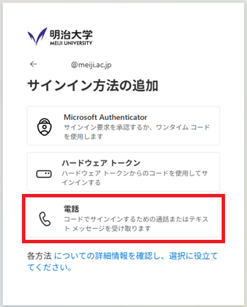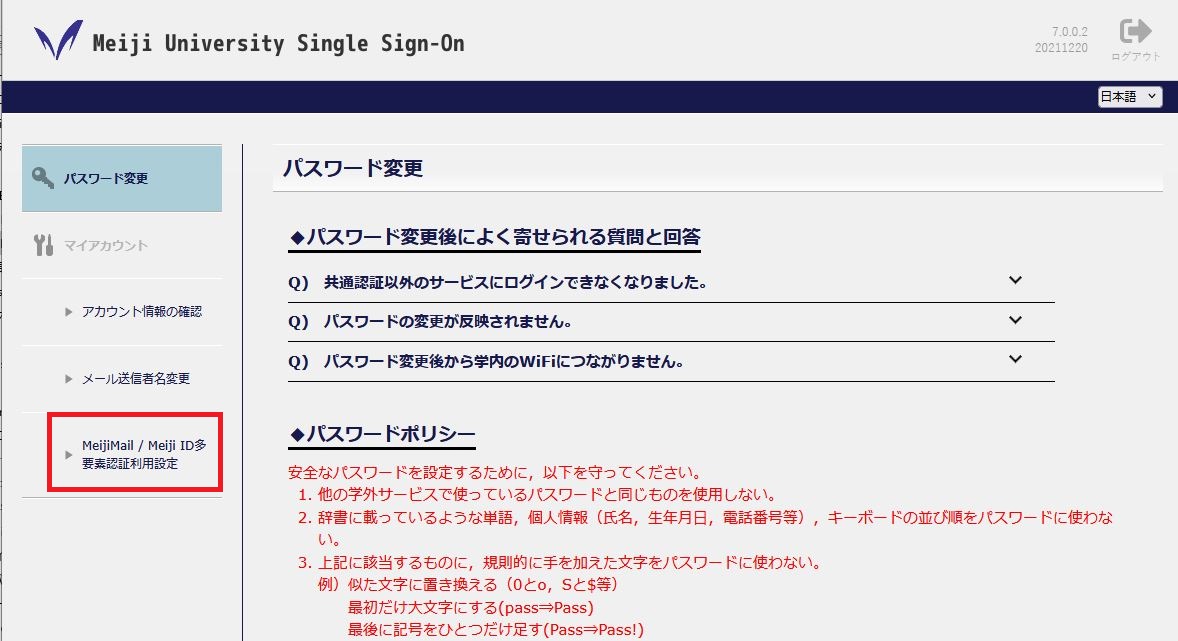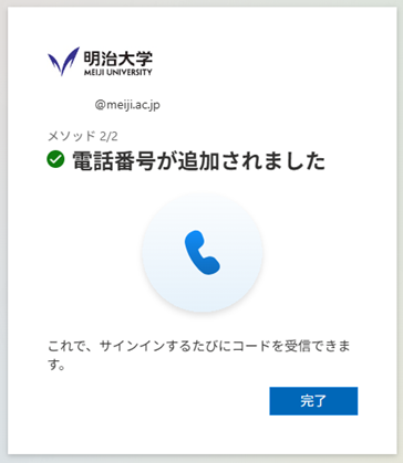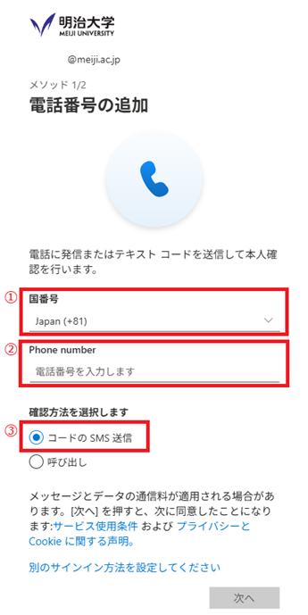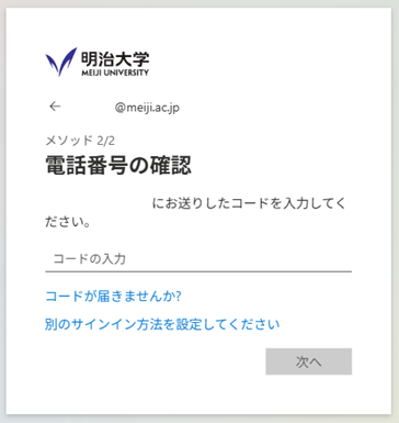 【準備するもの】 ・携帯電話またはスマートフォン(SMSが受信可能であること) ・パソコン 【作業を始める前に】 ・自宅等の学外から設定を行う場合は、手順の途中で最大30分ほど待つ箇所があります。時間に余裕のある時に行ってください。 学内から実施する場合はすぐに設定を行うことができます。 ・「Meiji Mailアカウント」と「Meiji ID」の多要素認証の設定は共有しています。 「Meiji Mailアカウント」で行った多要素認証の設定は、即時、「Meiji ID」にも反映されます。(逆も同様) ・「3.携帯電話番号の登録」の最後の手順まで完了していないアカウントは、毎日AM5:20(日本時間)に自動的に多要素認証「無効」の状態にリセットされます。この時間帯近辺は避けて作業をしてください。 リセットされた後に再度設定を行う場合は、「2.多要素認証の有効化」から実施してください。