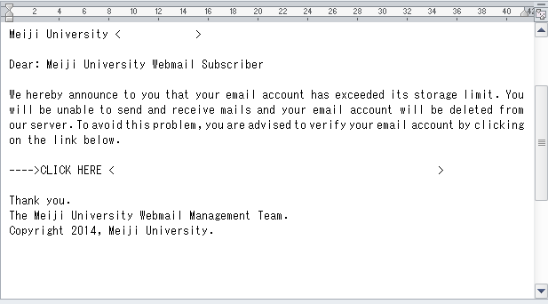 2014年7月28日前後より,以下のような,発信元が明治大学であるかのように偽ったメールが不特定多数宛に配信されていますが,本学とは無関係のメールです。