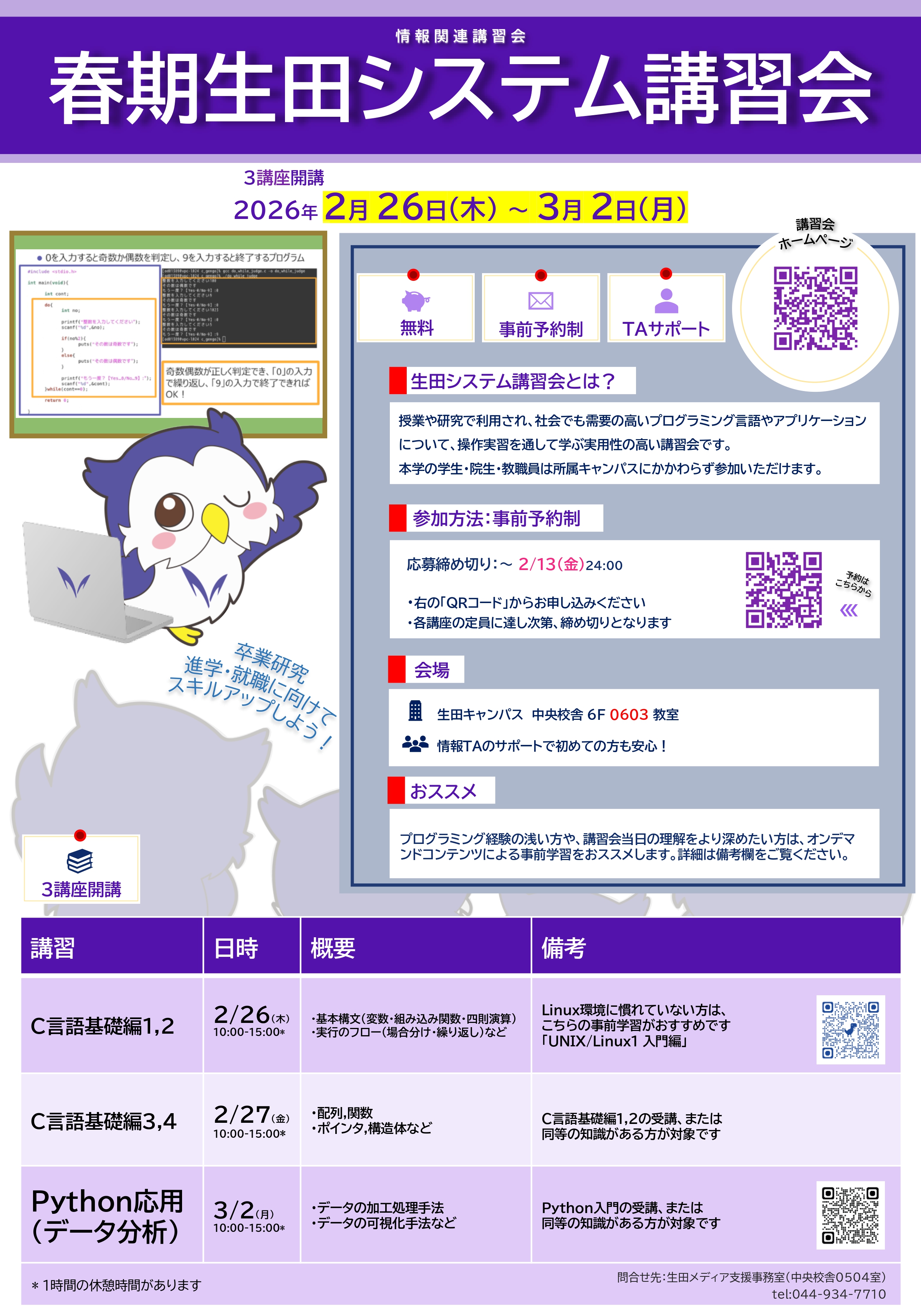 春期生田システム講習会( C言語, Python応用(データ分析))について【2/26~3/2開催】