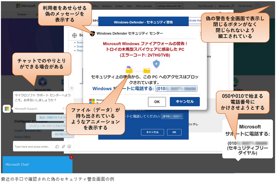 「今すぐ〇〇に電話してください」は偽物の可能性が高いので、電話をしないでください。偽のサポートセンターへ電話をかけ、相手の言う通りに操作した結果、自分のパソコンが遠隔操作されたり、パソコン内のファイルやOneDrive上のファイルをコピーされる等、重大な情報漏えいに繋がる恐れがあります。