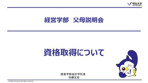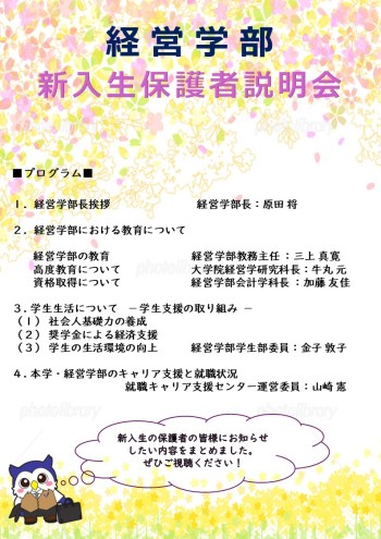 さて、当学部では、新入生の保護者の皆様を対象に、「当学部の教育について」ならびに「学生生活にあたっての留意事項」、「キャリア支援・就職状況」等についてオンライン(オンデマンド)形式で実施いたします。