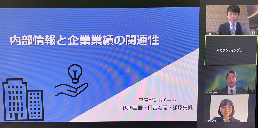 平屋ゼミナールBチームは「内部情報と企業業績の関連性」という研究発表を行いました。