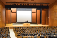 感染防止対策のために2会場に分かれての実施となりましたが、副会場にはホールの様子がライブ配信され、ファイナリストの英語に中学2年から高校I年の3学年が耳を傾けました。最後には中学2年生による楽しいショートスキットが披露され、なごやかな雰囲気で終えることができました。