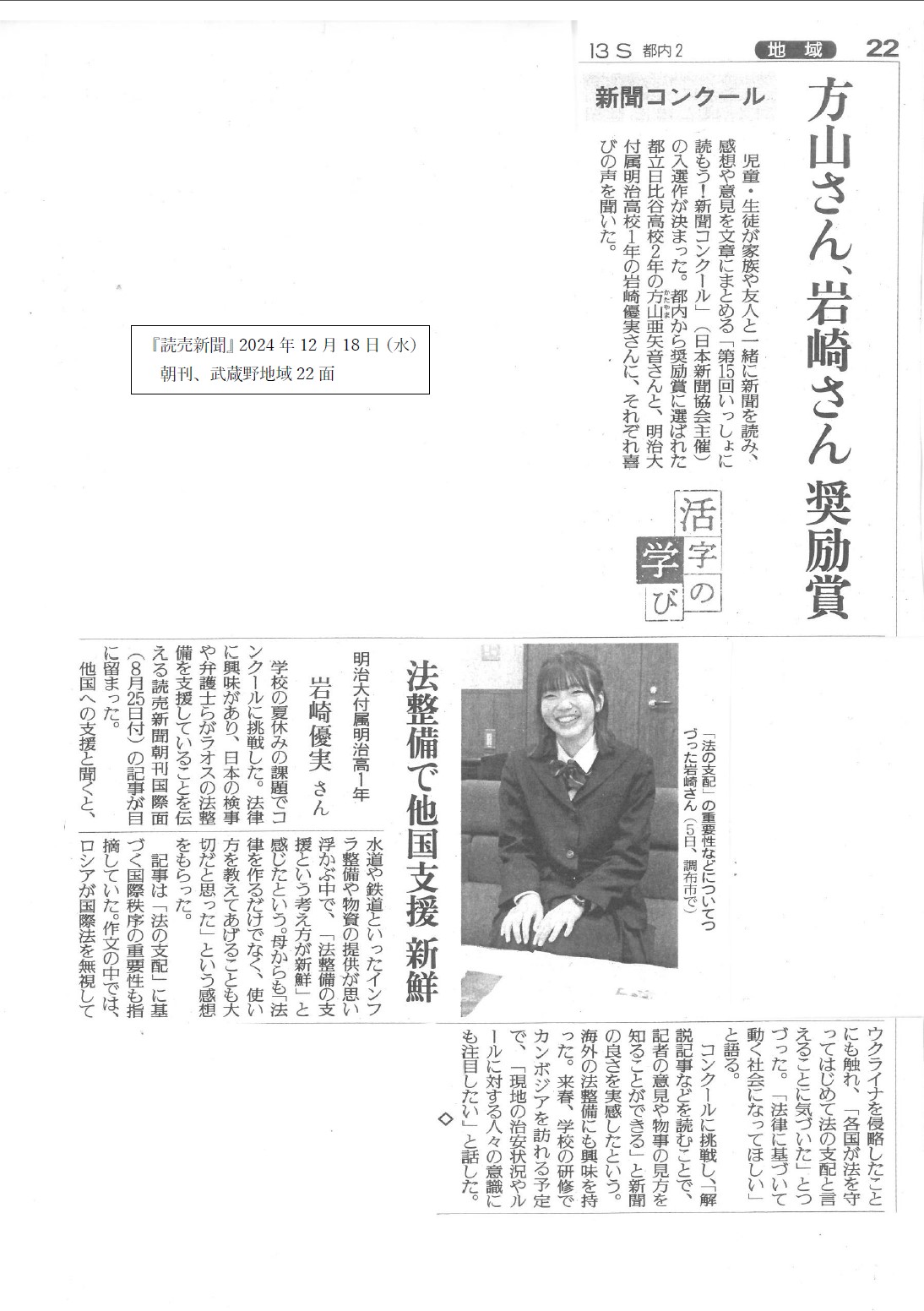 NIE(Newspaper in Education/教育に新聞を)の実践活動として応募したNIE推進協議会主催「いっしょに読もう!新聞コンクール」で東京都最優秀賞を受賞した岩﨑さん(高1)が12月5日に読売新聞社記者からインタビュー取材を受けました。そして、その記事が12月18日(水)『読売新聞』朝刊の武蔵野地域面に掲載されました。