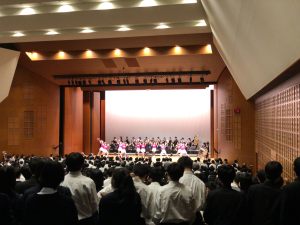 2月14日5・6時間目、全校生徒が鵜澤総明ホールに集まり、高3歓送会が実施されました。卒業する高校3年生に向けて、応援指導班、吹奏楽班、ダンス部、マンドリン部がパフォーマンスを行い、また、卒業を祝い感謝を伝える動画も披露されました。