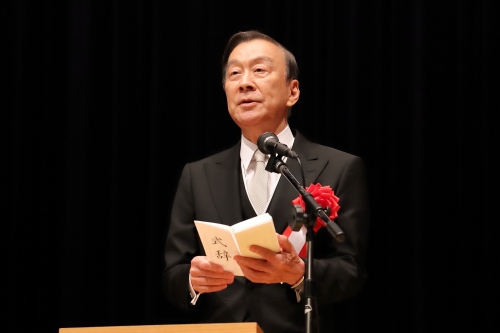 続いて、来賓として柳谷孝理事長(学校法人明治大学)が、その冒頭で井家上校長の話を引きとる形で、「人と自分を比較するのではなく、人とつながることが大切」と生徒に語りかけて式辞を始められました。また、上野正雄学長(明治大学)、水谷彰宏PTA会長(明治高等学校・中学校PTA)が祝辞を述べました。