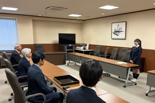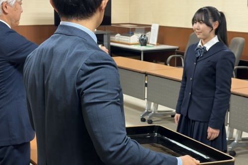 高校3年生藤原泉美さんの作文「『命をつなぐ音』が教えてくれたもの」が「税に関する高校生の作文」で武蔵府中税務署長賞を受賞し、12月2日、表彰式が行われました。この日は、武蔵府中税務署の青柳和嗣副署長が本校にお越しくださり、直接表彰状が藤原さんに手渡されました。
