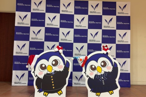 12月25日、本年度最後の広報行事となる施設見学会が行われた。この日から冬休みに入っていたため少しさびしい校内でしたが、施設はもちろん部活動に励む生徒などを見ていただきました。今回の施設見学会から写真撮影可能スポットとしてがバックパネルが設置されました。本校制服版のめいじろうもいて、今日は特別にサンタ帽子もかぶっていました。寒い中がご来場いただいた方がありがとうございました。