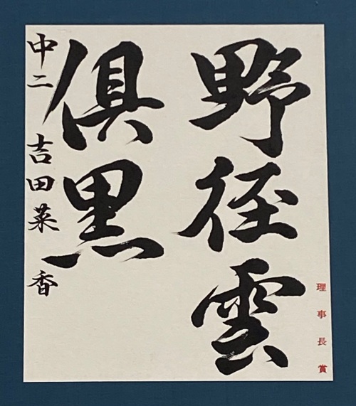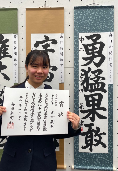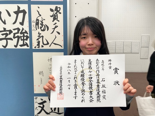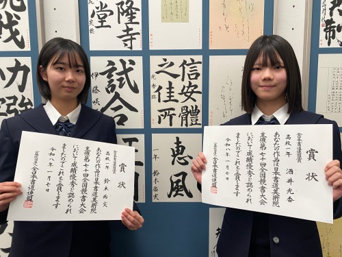 石坂さんは全国競書大会の最高賞を受賞し、吉田さんは全国競書大会と教育部展の両方で上位個人賞を受賞するダブル受賞となりました。
