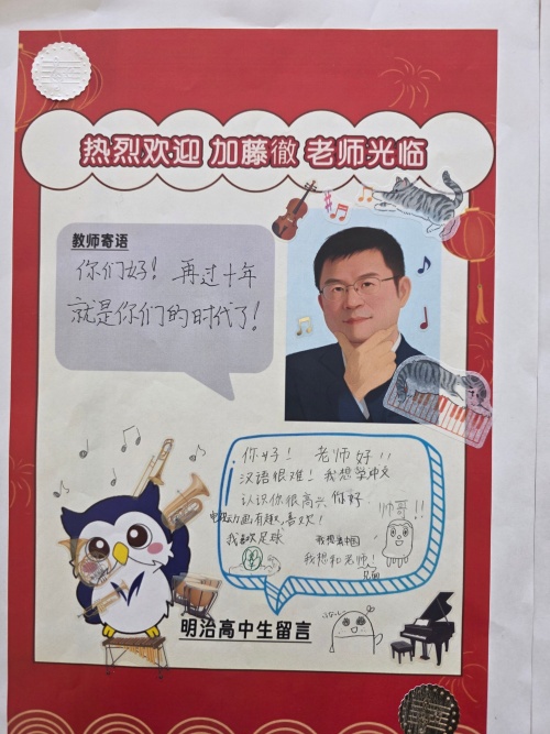 今回、加藤先生をお招きするに当たり、生徒たちは歓迎のポスターを作成しました。生徒たちが中国語で書いたポスターに、当日加藤先生からお返事をいただきました。「みなさんこんにちは。10年後、今度は君たち(あなたたち)の時代になるよ」という力強いメッセージでした。