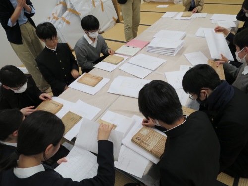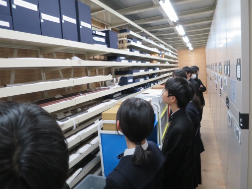 当日は、まず学芸員の日比佳代子先生に博物館のバックヤードを案内して頂きました。普段は入ることのできないバックヤードに入り、毛利家文書を見学しました。古文書の整理・概要調査・目録化の重要性を学び、史料に触れるという貴重な体験をしました。部員は、未整理状態の史料を目の当たりにし、史料整理の大変さを実感したようでした。