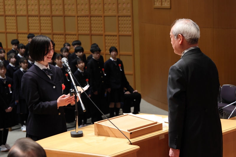 新入生を代表して日野あおいさん(高1)が、「明校生」として質実剛健・独立自治の精神の下、生徒の本分を尽くすことを誓いました。