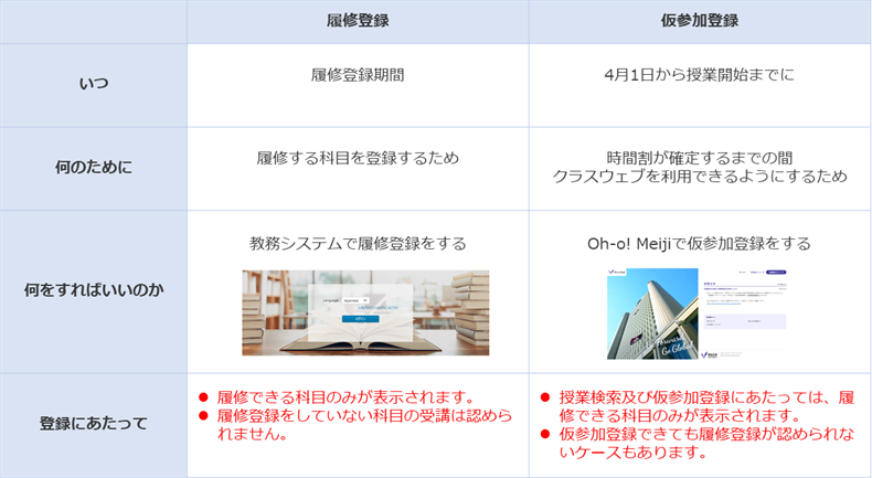 Oh-o! Meijiの授業検索及び仮参加登録は、ご自身が履修できる科目のみが表示されます。履修が認められていない科目は表示されません。これは教務システムでの講義検索及び履修登録でも同じです。