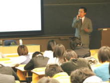 コーディネーター:竹下俊郎(政経) 取材日:12月11日(火)4限 テーマ:急成長する国際商品市場─不振の日本 ゲスト講師:倉沢章夫(時事通信社編集局総務・解説委員) 時事通信社の寄附講座として昨年度から始まった本講座。2年目となる今年度の各回のテーマは「政治取材の現場」「爆発するソーシャルメディア」「お役所言葉を翻訳する」「事件取材と戦争取材」など。 取材当日は「急成長する国際商品市場−不振の日本」のテーマで、BRICs(ブラジル・ロシア・インド・中国)の発展と石油の高騰、食糧とエネルギーの争奪、先物市場とファンドなどについての講義。普段新聞やニュースで報じられている世界経済の背景についての詳細な分析は学生の興味を引き、皆真剣な面持ちで講義に聞き入り、ノートをとっていた。授業終了後は、学生が倉沢氏のもとへ駆け寄り、盛んに質問を投げかけたり、より分かりやすい授業のための改善点について、学生自らの視点で感じたことを伝えている姿も見られた。 講義の感想について聞くと「つい先日までゼミで食料争奪を取り上げていたので、興味深かった」(政経3・男子)「バイオエタノールなどの話題はテレビで見て知っていたが、ガソリンの代替としての活用でとうもろこしの価格が上がり、さらに投資ファンドが…といった一連の関連が分かった」(商3・男子)など声が聞かれた。 講義は時事通信社の記者らが担当。「自分の学部外の分野についても興味が広がった」(情コミ3・女子)「普段は取材の結果としてのニュースしか知り得ないが、取材の過程が分かった」(商3・男子)「講師の方が仕事の時間を割いて来てくれる。本当にありがたい」(情コミ3・女子)とこの講座ならではの恩恵についても話していた。 今年度は時事通信社のほかに、共同通信社、朝日新聞社の寄附講座も現代メディア講座として開講された。竹下教授は「現場の第一線で活躍する人の話を聞くことができる。せっかくの機会なのだから、講師にどんどん質問して自己主張し、人脈も作る。明治の『押しの強さ』を発揮してほしい」と学生にエールを送っていた。 1.地球市民講座 「現代フランス研究−変貌するフランスの若者」 2.技術戦略とビジネス講座 「青年社長養成講座2」 4.キャリアデザイン講座 「図書館活用法」 5.歴史・哲学講座 「日本近代史と明治大学2」 インタビュー 「さまざまな波及効果に期待」 二部教務部長 吉田 悦志 特集・授業参観「学部間総合共通講座」TOP 前のページに戻る