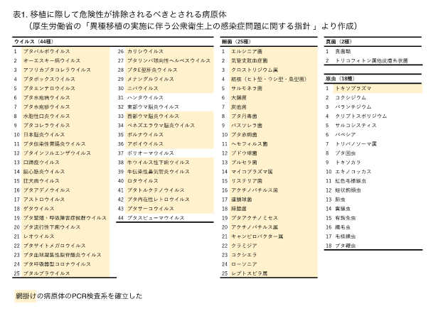 厚生労働省は「異種移植の実施に伴う公衆衛生上の感染症問題に関する指針※注」の中で、「移植に際して危険性が排除されるべきとされる病原体」として、ウイルス44種、細菌25種、真菌2種、原虫18種の合計89種を挙げています。このうち最も感染リスクが懸念されるのは、母ブタから垂直伝播しうる病原体(おもにウイルス)であり、これらの検査系確立が急務でした。井上教授と三浦特任助教らは上記の89種のうち、とくに優先度の高いウイルス40種、細菌25種、原虫1種を対象とする高感度なPCR検査パネルを確立しました(表1)。本パネルによって検査できる病原体数は現時点で世界最多であり、例えば、異種移植で先行するニュージーランドの合計25種(ウイルス14 種、細菌8種、原虫3種)を大きく上回るものです。また、本研究で確立したPCR検査系の大部分は、PCR反応条件が統一されているため、多くの病原体を一括で検査できるような工夫もなされています。
