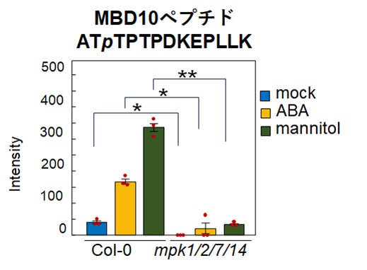 MBD10は、野生型(Col-0)ではABA処理や浸透圧(マンニトール)処理によってリン酸化される。一方、タンパク質リン酸化酵素の一種であるMAPKを4つ破壊した変異体(mpk1/2/7/14)ではリン酸化されないため、これらのMAPKがMBD10をリン酸化していることが推測できる。