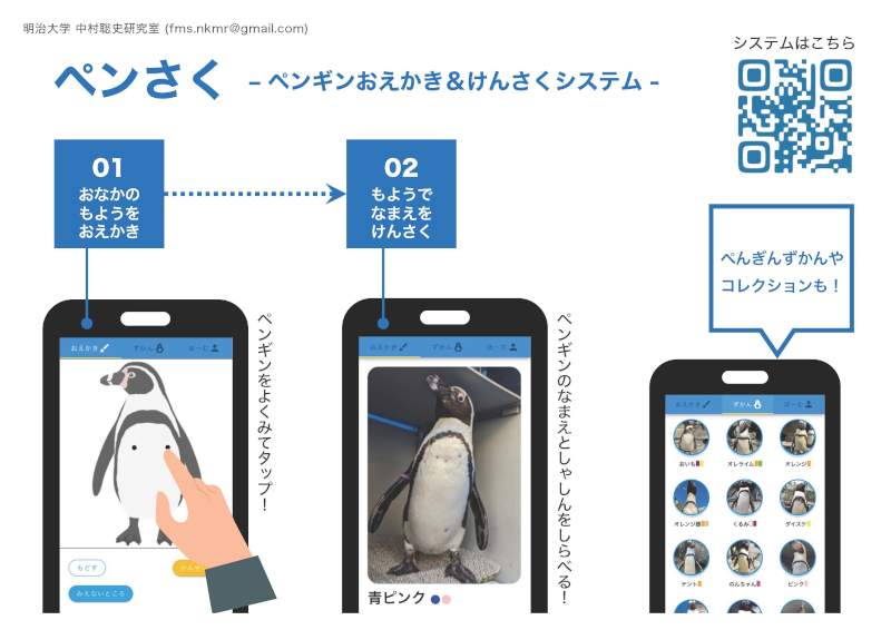 近年、動物園や水族館では、生き物の「個」の魅力の発信によって新たな発見やより深い関心を促し、それを「種」や生物本来の生態・保全などにつなげていくという取り組みが注目されています。サンシャイン水族館でも、個体ごとの特徴や生態への理解を深めてもらうため、この度新たな試みとして、明治大学 総合数理学部 中村聡史研究室が開発したペンギン個体識別システム「ペンさく」を水族館来場者に体験していただく実証実験の場を提供することとなりました。