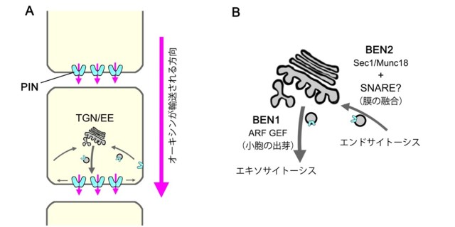 植物ホルモンの一種であるオーキシンは、PIN タンパク質などの排出輸送体により細胞の中から外に汲み出され、AUX1 などの流入輸送体により細胞の中に取り込まれることがわかっています。PIN1 や PIN2 などのタンパク質は、細胞膜の一部の領域に偏って分布することで、細胞の特定の方向にオーキシンを汲み出し、組織の中でのオーキシンの極性輸送に貢献していると考えられています。これまでの研究により、PIN タンパク質は細胞膜に安定に存在しているのではなく、エンドサイトーシスとエキソサイトーシス(細胞膜へのリサイクリング)を繰り返すことで細胞膜での偏りを保ったり、状況に応じて異なる細胞膜領域に移動すると考えられていました(図1)。田中准教授らはこれまでに、蛍光イメージングを活用したスクリーニングにより PIN タンパク質の細胞内での小胞輸送注3が異常になったシロイヌナズナの変異体 ben1 と ben2 を単離していました。また、ben1 変異体の異常の原因となっている遺伝子は低分子 G タンパク質の活性制御を担う ARF GEF の1つである MIN7/BIG5 をコードしており、ben2 変異体の原因遺伝子は Sec1/Munc18 ファミリーのタンパク質の一種である VPS45 をコードすることを見出していました。さらに、VPS45 はトランスゴルジ網(TGN)注4に局在する SYP4 グループの SNARE タンパク質と相互作用すること、ben2 変異によりその相互作用が弱まることも明らかにしていました。BEN1/MIN7/BIG5 と BEN2/VPS45 はどちらも TGN に分布する膜交通因子であることや、変異体の細胞レベルの表現型などから、BEN1/MIN7/BIG5 は TGN からの小胞の出芽に、BEN2/VPS45 は TGN への膜の融合に関わることで、PIN タンパク質の細胞内輸送に関わっていると推測されていました。また、BEN2/VPS45 は SYP4 SNARE タンパク質の制御を介して働くことが示唆されていました。田中准教授らのグループはben1;ben2 二重変異体は主根が短く、子葉の維管束が不連続になるなどのオーキシンに関連する異常を示すことが明らかにしていました。一方、