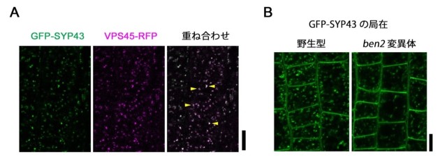 図2: BEN2/VPS45 は SYP4 と共局在し、SYP4 の TGN 局在を促進している