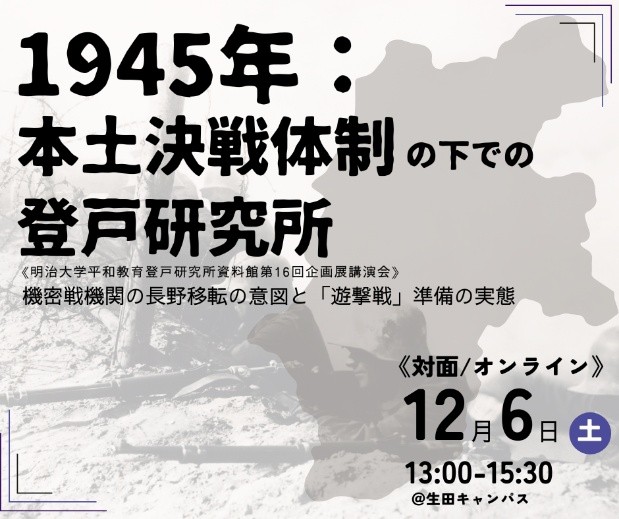 なお、本講座は明治大学平和教育登戸研究所資料館 第16回企画展「その時、わたしたちは戦うことを命じられた—登戸研究所と本土決戦体制—」の関連講演会です。