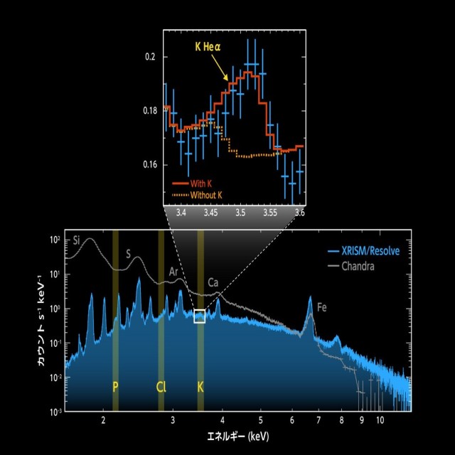 明治大学理工学部物理学科の佐藤寿紀専任講師、京都大学理学研究科の松永海(博士後期課程2年)、内田裕之助教等の研究グループは、X線分光撮像衛星(クリズム;X-Ray Imaging and Spectroscopy Mission)による超新星残骸カシオペア座Aの精密X線分光観測によって、巨大な恒星の内部で塩素やカリウムが大量に合成されていたことを明らかにしました。この成果は、恒星の内部活動が、宇宙における生命必須元素の供給源として重要な役割を果たしていることを示唆しています。明治大学がこれまで開発に携わった高分解能分光装置「Resolve(リゾルブ)」による観測成果です。