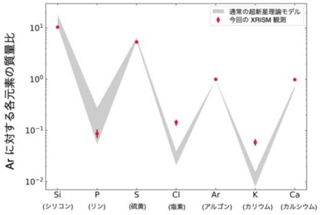 図3: XRISMによるカシオペア座Aの元素量の測定結果(赤データ点)と理論モデル(灰色領域)との比較。