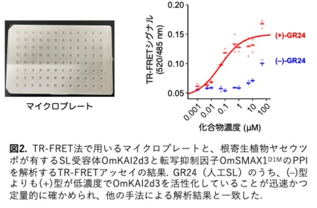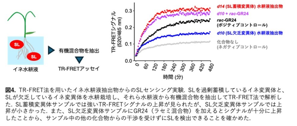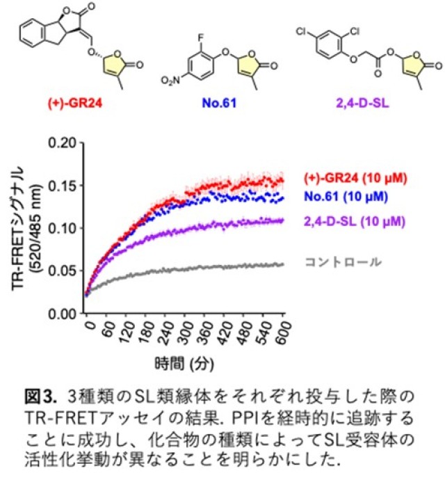 本研究グループは、SLが誘導するPPIを迅速かつ定量的に測定する手法を開発することで、SLやSL受容体の詳細な機能解析や、SL様活性を示す新たな分子を探索することが可能になると考えました。そこで、定量性・スループット性・頑健性に優れ、経時的に変化を追跡することができる時間分解Förster共鳴エネルギー移動注3(Time-Resolved Förster Resonance Energy Transfer; TR-FRET)を利用したPPI解析法を採用しました。具体的には、SL受容体へ蛍光タンパク質mEGFPを融合し、MAX2もしくはSMAX1/SMXLを発光性テルビウム(Tb)錯体で標識することで、両者が近接した際にTb錯体からmEGFPへのFRETが生じるようにデザインしました。実際の実験と解析は、タンパク質やリガンドをマイクロプレート内で混合し、mEGFPとTb錯体の蛍光強度を同時測定して比を取るという非常に簡便な操作で完結します(図1)。この方法によって、さまざまなSL類縁体の活性や、受容体のSLに対する感受性を評価することに成功しました。また、PPI誘導の時間変化を追跡することにも成功し、この特性を活かした機能解析が可能になりました(図2)。さらに、TR-FRETが夾雑物の影響を受けにくい利点を活かし、イネの根から分泌された有機混合物をTR-FRET法で調べることで、分泌物中に含まれるSLを特異的に検出することに成功しました(図3)。