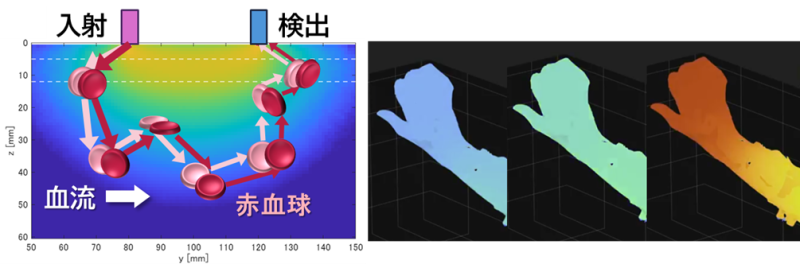 直進性の高い近赤外光を生体内に入射すると、光子は組織中の赤血球によって散乱される(左)。血流が速く赤血球の運動が大きいほど、検出される光強度は時間的にランダムに変動する。この変動特性から、組織血流速度を非侵襲的に計測できる。開発したセンサを用いて前腕の血流変化を計測すると、心拍に同期した血流の脈動や、部位ごとの酸素需要の違いに応じた血流速度分布を可視化できる(右)。