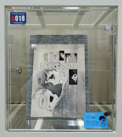 「裏切者」解決編より1ページ。「裏切者」は前後編で完結せず、解決編が描かれておわった。こういう場合は「完結編」となるのが普通で、「解決編」というのは珍しいかもしれない。だが、「裏切者」のストーリー自体にミステリー的要素があるので、話を通して読むと、解決編という言い方がとてもしっくりくるのがわかる。展示したページは、サーニンが愛馬エルとレースに出場したものの、やむを得ない事情で、疾走している途中、故意に立ち止まった一連のシーンのうちの1ページである。周囲の馬が走り抜けていく中、サーニンが空を見上げる様子を、中央に映画のフィルムを縦に置いたような、とても効果的で斬新なコマ割りで見せている。『花とゆめ』のマンガスクールへの投稿者のうち、上位投稿者に配る複製原画に選ばれるほどのシーンだったことが、右欄外をみるとわかる。