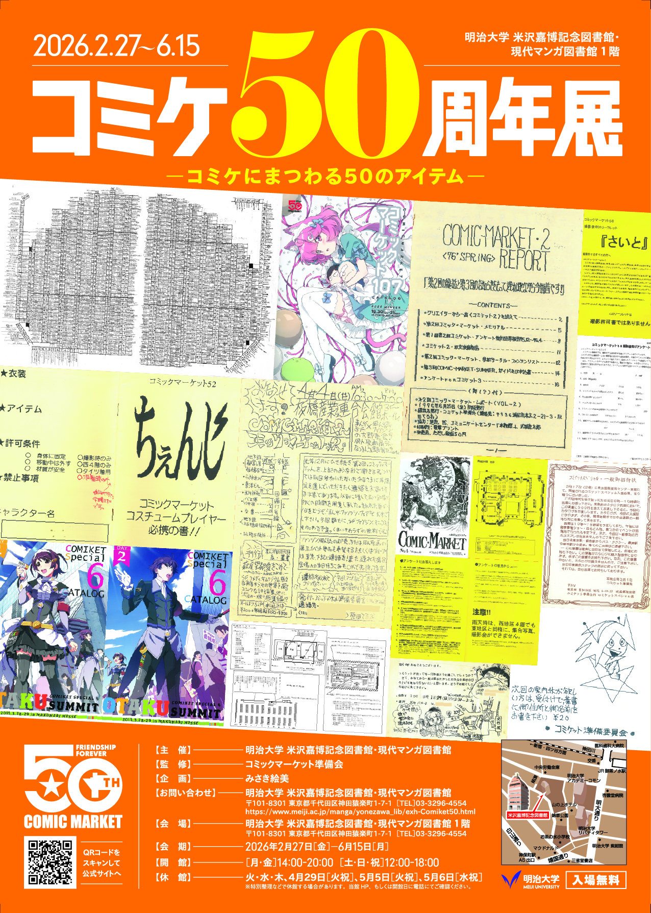 1975年に始まったコミックマーケット(コミケ)は、マンガの多様な表現、自主制作の同人誌発表の場を作り続けてきました。マンガのみならず文章、音楽、写真などさまざまな自己表現を包み込み、50年続いてきたこの同人誌即売会は、2025年12月の開催で107回を数えました。50年の間には陰に日向に、1回1回の開催を繋いできた人々がおり、その痕跡は資料となって残されています。コミックマーケット創設者のひとりであり、第2代代表を長く務めた米沢嘉博氏の資料も合わせ、初期から現在までを貴重な資料から振り返ります。
