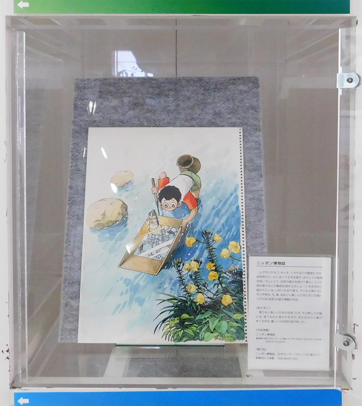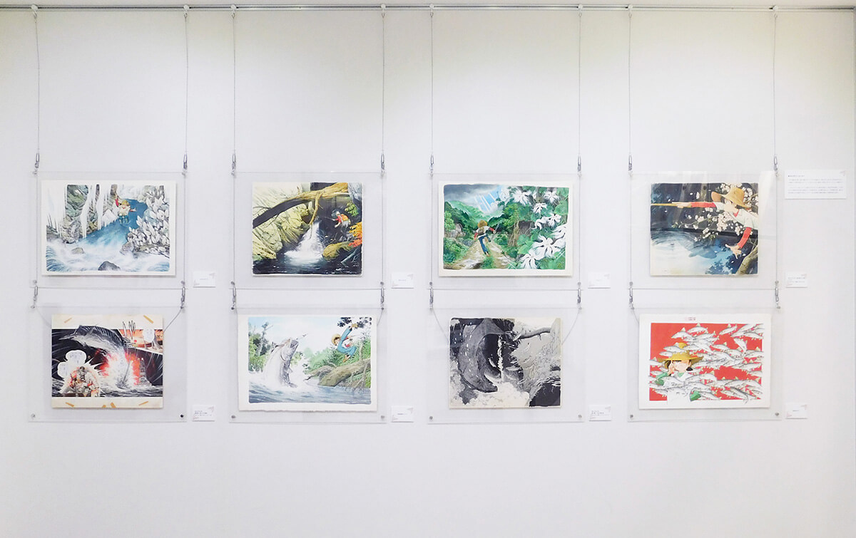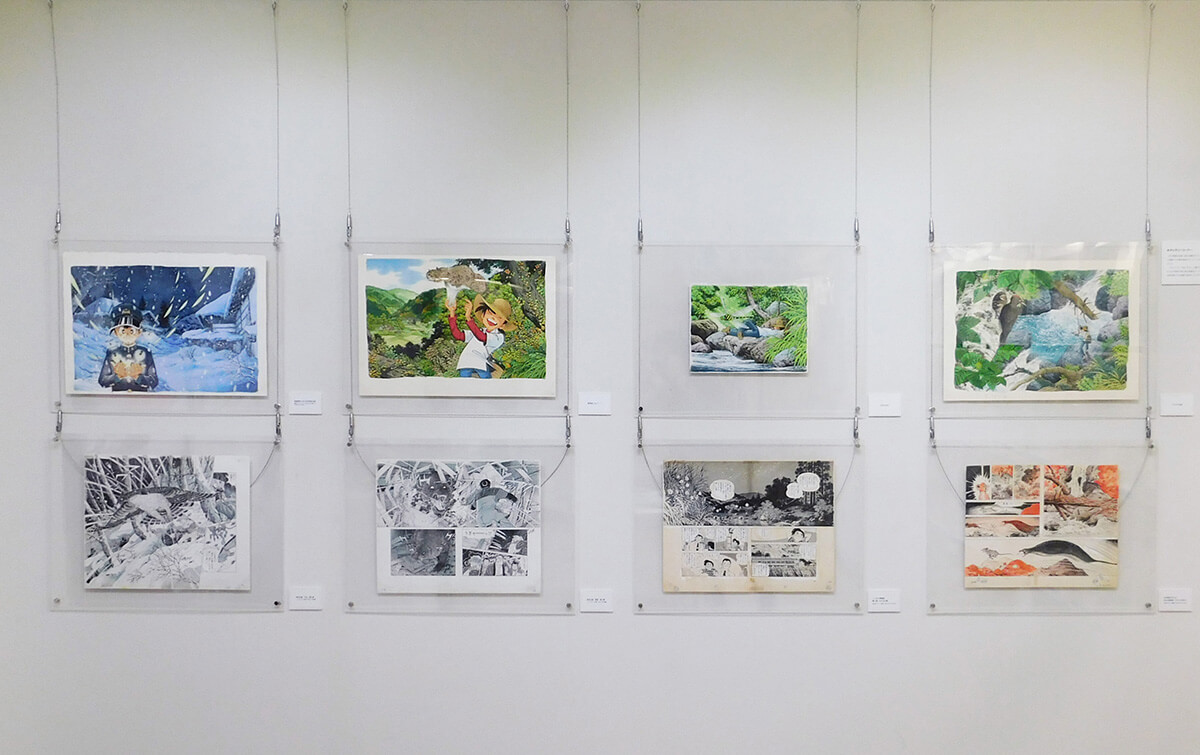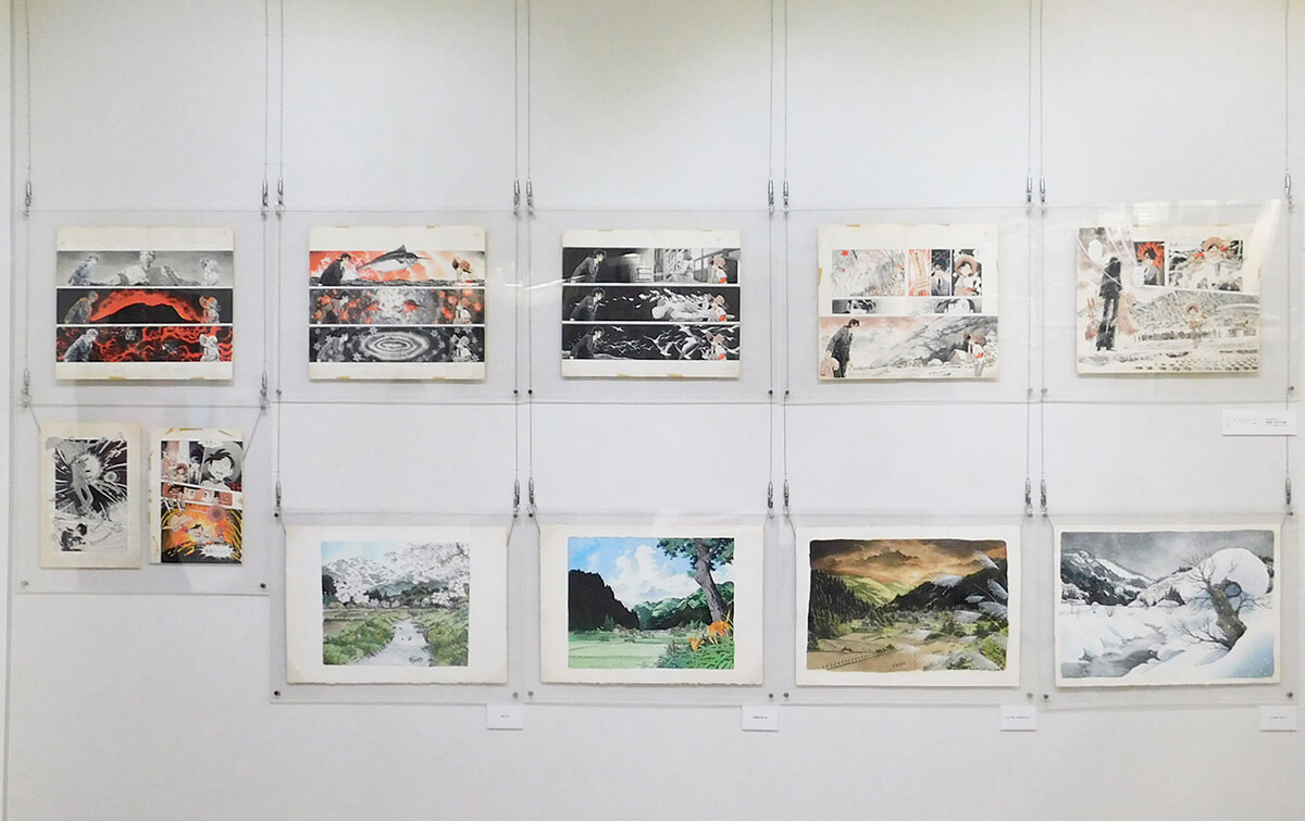 会期を4期に分け展示します。会場正面壁には、四季折々の日本の情景を描いた美しいイラストや、「釣りキチ三平」をはじめとする代表作の迫力ある見開きページを展示します。