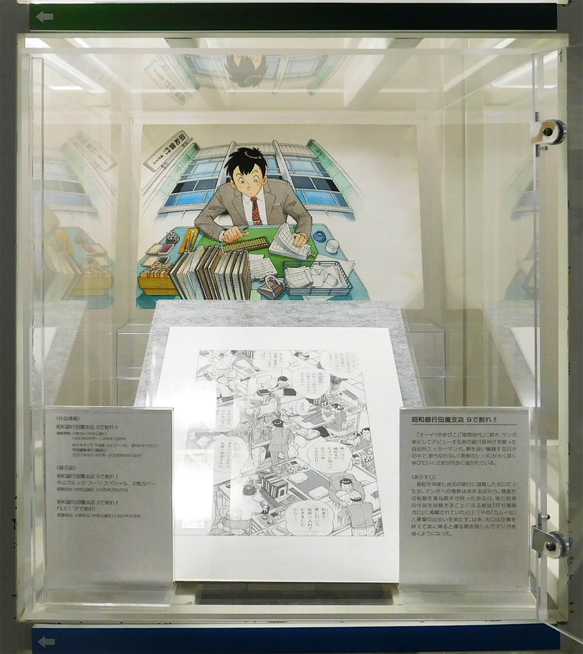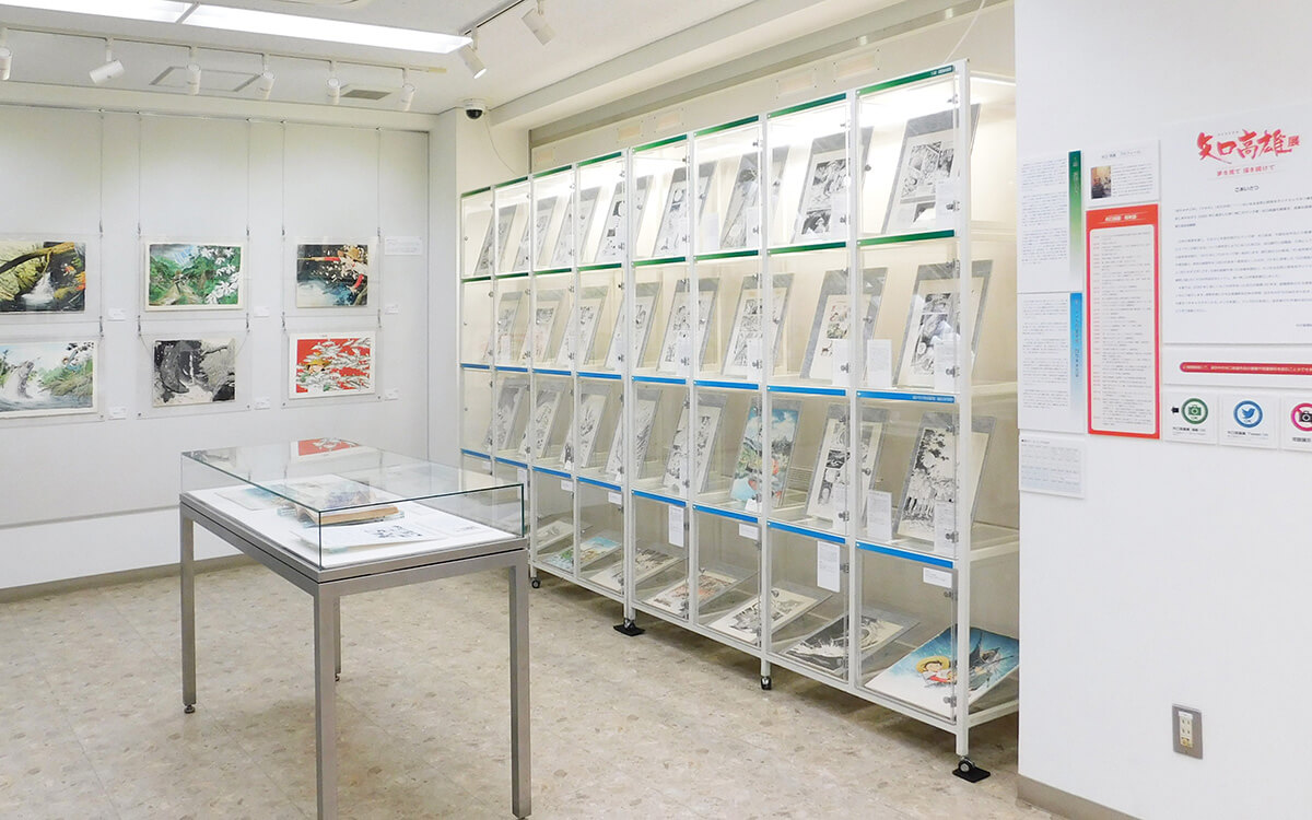 2階閲覧室で、矢口高雄の著作や関連書籍を読むことができます。