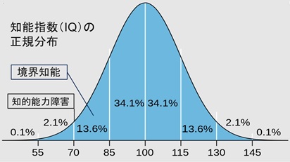 知的障害は、このごろは知能指数だけを診断の根拠にはしませんが、少し前まではIQ70を基準に診断していました。つまり、70未満を知的障害とみなしていたのです。正規分布でみてみると、その人口は全体の2.2%であることがわかります。