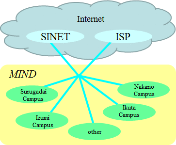 MINDは、国立情報学研究所のネットワークであるSINETと、インターネットサービスプロバイダへの接続を通じて、広大なInternetの一部となっています。