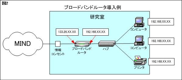 実験室等の情報コンセントと、室内のコンピュータとの間にブロードバンドルータを設置することによって、MINDと室内のコンピュータが直接つながらなくなります。