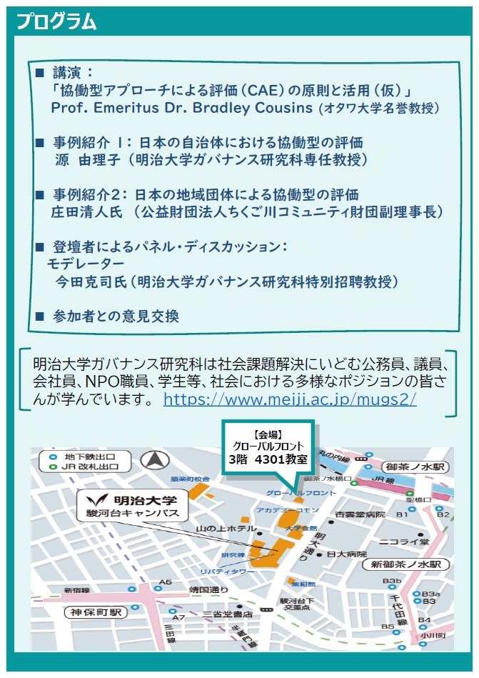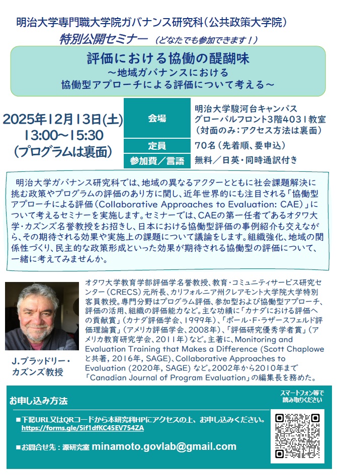 明治大学ガバナンス研究科では、地域の異なるアクターとともに社会課題解決に挑む政策やプログラムの評価のあり方に関し、近年世界的にも注目される「協働型アプローチによる評価(Collaborative Approaches to Evaluation: CAE)」について考えるセミナーを実施します。セミナーでは、CAEの第一任者であるオタワ大学・カズンズ名誉教授をお招きし、日本における協働型評価の事例紹介も交えながら、その期待される効果や実施上の課題について議論をします。組織強化、地域の関係性づくり、民主的な政策形成といった効果が期待される協働型の評価について、一緒に考えてみませんか。