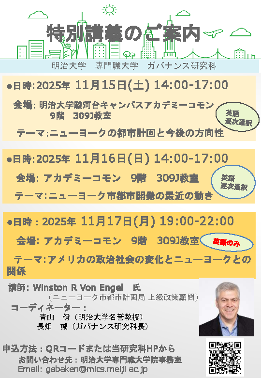 明治大学専門職大学院ガバナンス研究科は、11月15日(土)から17日(月)の期間で、Winston R Von Egel氏をお招きし、特別講義を開催します。本研究科在学生・修了生の他、一般の方もご参加いただけます。奮ってご参加ください。