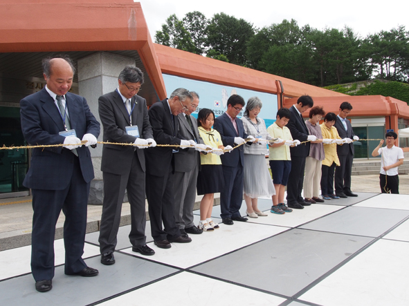今回の重要文化財の海外輸出は,石壮里博物館からの依頼に基づき,文化庁の承認を得て実現しました。重要文化財の運搬は美術品梱包業者が行い,岩宿博物館と明治大学博物館のスタッフが同行して現地で展示作業を行いました。7月15日に石壮里博物館で行われた開幕式典には,日本側から尾﨑享子氏(みどり市教育長),石原亨夫氏(みどり市文化財課長),小菅将夫氏(岩宿博物館長),安蒜政雄氏(明治大学文学部教授),風間信隆氏(明治大学博物館長),島田和高氏(明治大学博物館学芸員)が参列し,複製の石器を使ったテープカットも行われました。
