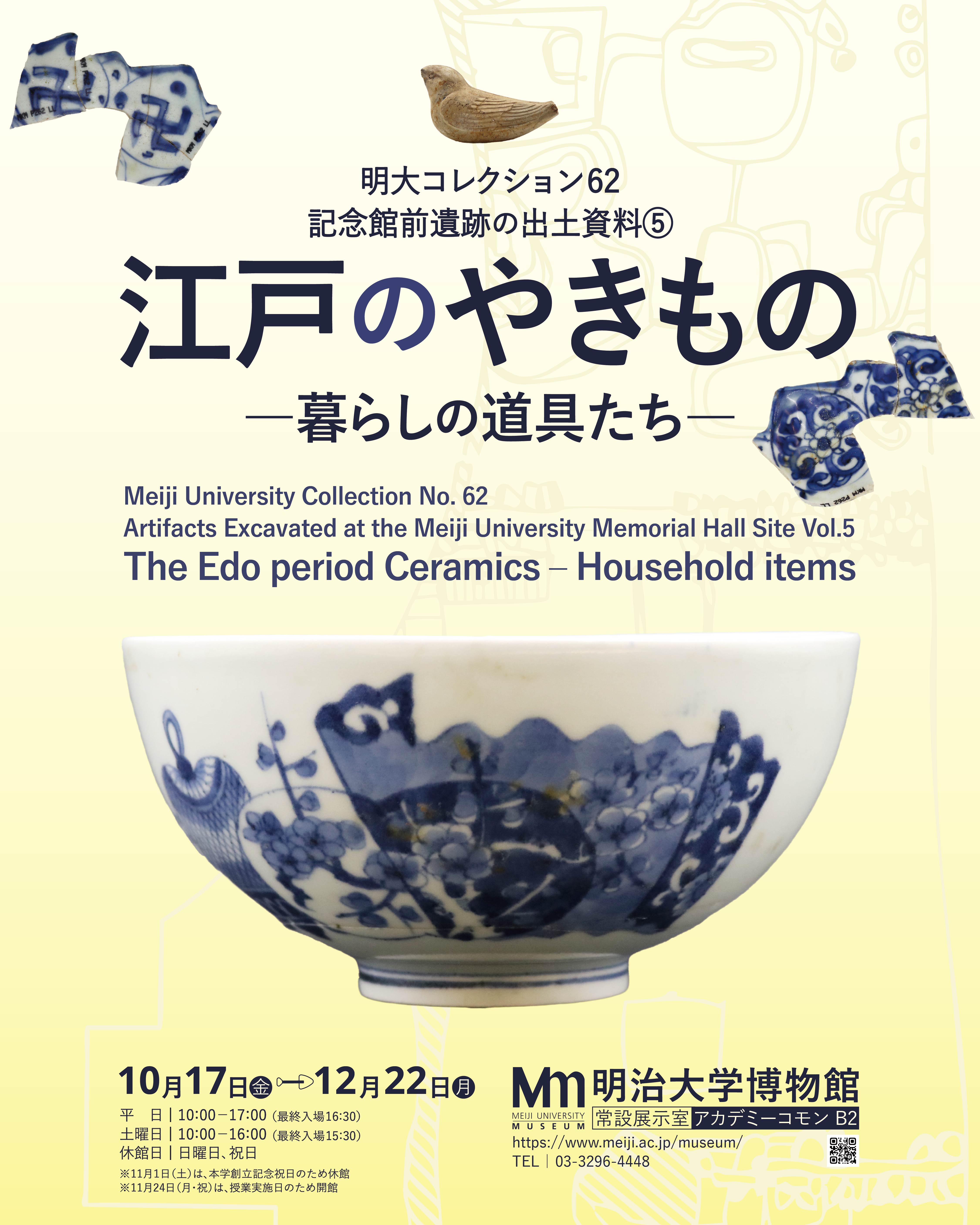 明治大学駿河台キャンパスのリバティタワーが建つ場所には、かつて「記念館」という校舎がありました。「明治大学記念館前遺跡」は、その校舎の建て替えに伴い1995年11月28日から1996年3月25日までの約4カ月間(調査面積:約950㎡)にわたって実施された発掘調査によって明らかになった遺跡です。この地には、かねてより4000石の旗本・中坊氏の屋敷があったと伝えられていましたが、調査の結果、遺跡の南半分が中坊氏、北半分が東條氏の屋敷の一角であったことが確認されました。発掘調査では、建物の一部をはじめ、衣食住にかかわる生活用具や調度品など当時の暮らしを物語る多彩な資料が出土しました。これらの出土品は、明治大学博物館において保存・保管され、教育・研究に活用されるとともに展示を通じて一般にも紹介されています。 今回の展示はシリーズ第5回として、陶磁器をはじめとしたやきもののなかから注目の資料を選んで展示します。江戸時代の人々の日常生活の中で親しまれ、使用されたであろう多種多様なやきものの姿をご紹介します。 ※小規模展示となりますので、ほかの展示と併せてご覧ください。