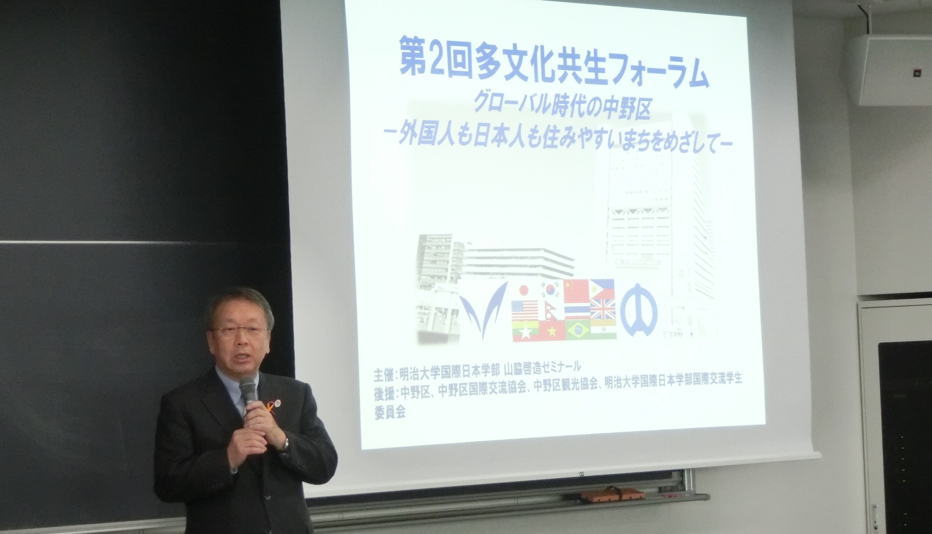 2014年11月22日、明治大学中野キャンパスにて、第2回なかの多文化共生フォーラム「中野区のグローバル化-外国人も日本人も住みやすいまちをめざして」が開催されました。主催したのは国際日本学部山脇ゼミで、後援団体は中野区、中野区国際交流協会、中野区観光協会、国際日本学部国際交流学生委員会でした。スタッフも含めると100名を超える参加がありました。